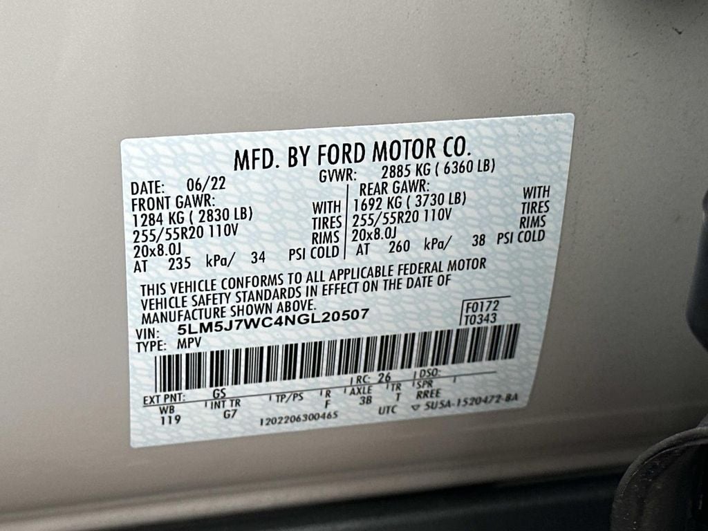 Elements Package Plus (Auto Air Refresh, Auto Heated/Ventilated Driver & Passenger Seats, Heated Steering Wheel, Heated VisioBlade Wipers, and Heated/Ventilated 2nd Row Outboard Seats), Equipment Group 200A, 14 Speakers, 3.58 Axle Ratio, 3rd row seats: split-bench, 4-Wheel Disc Brakes, ABS brakes, Air Conditioning, Alloy wheels, AM/FM radio: SiriusXM, Audio memory, Auto High-beam Headlights, Auto-dimming door mirrors, Auto-dimming Rear-View mirror, Automatic temperature control, Brake assist, Bumpers: body-color, Compass, Delay-off headlights, Driver door bin, Driver vanity mirror, Dual front impact airbags, Dual front side impact airbags, Electronic Stability Control, Emergency communication system, Four wheel independent suspension, Front anti-roll bar, Front Bucket Seats, Front Center Armrest, Front dual zone A/C, Front fog lights, Front reading lights, Fully automatic headlights, Garage door transmitter, Hands-Free Liftgate Delete, Heated door mirrors, Heated front seats, HVAC memory, Illuminated entry, Knee airbag, Leather steering wheel, Low tire pressure warning, Memory seat, Navigation System, Occupant sensing airbag, Outside temperature display, Overhead airbag, Overhead console, Panic alarm, Passenger door bin, Passenger vanity mirror, Power door mirrors, Power driver seat, Power Liftgate, Power moonroof: Panoramic Vista Roof, Power passenger seat, Power steering, Power windows, Premium Lthr Heated/Ventilated Fnt Captain's Chairs, Radio data system, Radio: Revel AM/FM Audio System w/14 Speakers, Rain sensing wipers, Rear air conditioning, Rear anti-roll bar, Rear audio controls, Rear dual zone A/C, Rear reading lights, Rear window defroster, Rear window wiper, Remote keyless entry, Security system, SiriusXM Radio, Speed control, Speed-Sensitive Wipers, Split folding rear seat, Spoiler, Steering wheel memory, Steering wheel mounted A/C controls, Steering wheel mounted audio controls, SYNC 3 Communication & Entertainment System, Tachometer, Telescoping steering wheel, Tilt steering wheel, Traction control, Trip computer, Turn signal indicator mirrors, Variably intermittent wipers, and Wheels: 20 Bright-Machined Aluminum.